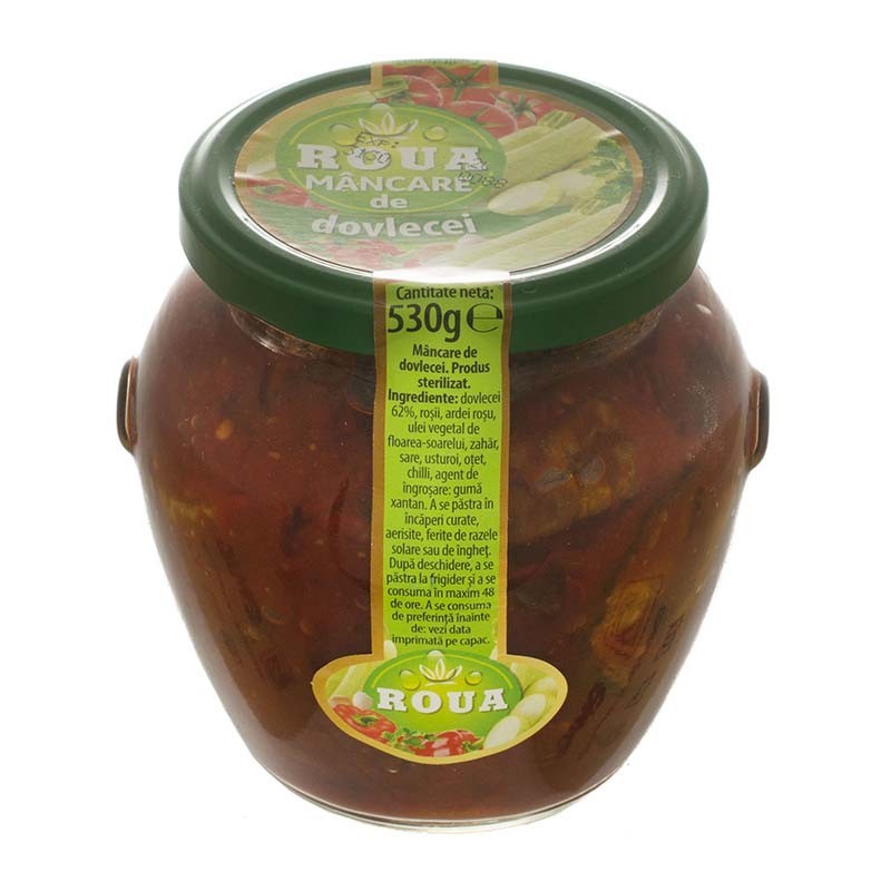 Ingrediente: Dovlecei 62%, rosii, ardei rosu, ulei vegetal de floarea soarelui, zahar, sare, usturoi, otet, agent de ingrosare: guma xantan.